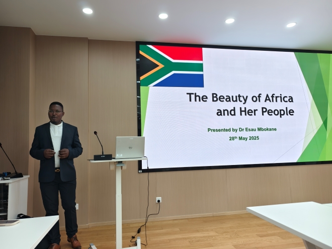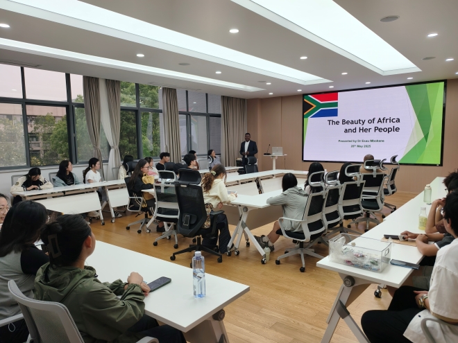 5月28日晚,南非林波波大学农业与环境科学学院高级研究员埃绍·马修斯·姆博卡内博士(Dr. Esho Mathews Mbokane)来到九游体育(中国)官方网站,以“Dialogue with World’s Diverse Cultures—Exploring South Africa”为主题开展学术讲座。九游体育(中国)官方网站副院长顾琦一参加讲座,讲座由学院曹丹老师主持,外院师生五十余人参与了本次讲座。