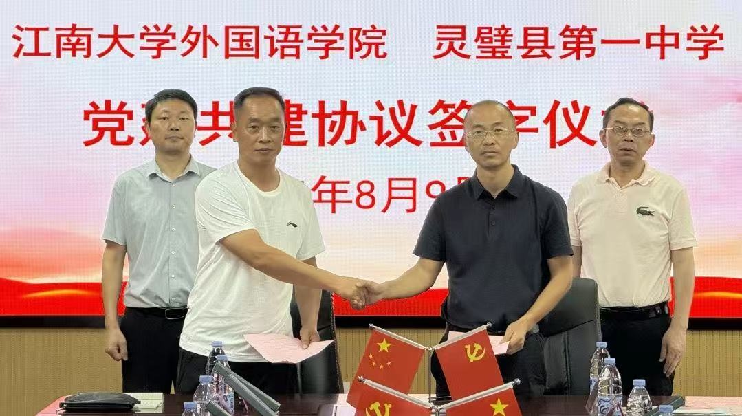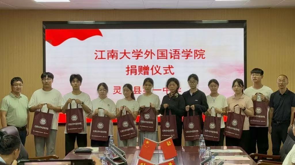 同日,师生们还前往灵璧一中进行交流学习,灵璧一中党委副书记刘亮,党委委员、纪委书记朱娄等参加活动。在座谈中,刘亮深入介绍了学校教学成果和党建情况,方文开介绍了学院在外语教育、课程建设、人才培养方面的成果与制度优势,季王飞则围绕“党政一体”党建模式分享经验,表达与灵璧一中在教师培训、学生交流、教学研究等方面深度合作的意愿。座谈后的捐赠仪式中,学院为该校优秀学子代表捐赠了一批精选书籍与文具,旨在以实际行动践行高校对基础教育的助力,也为两校后续深化教育合作、共育外语人才奠定温暖基础。随后,江南大学九游体育(中国)官方网站英语系党支部、日语系党支部,分别与灵璧一中党委第三党支部、第五党支部签订《党建共建协议书》,开启支部结对共建新篇章。同时,江南大学九游体育(中国)官方网站为灵璧一中授牌 “校外教学实习基地”,为两校共育外语人才提供实践平台与机制保障。
