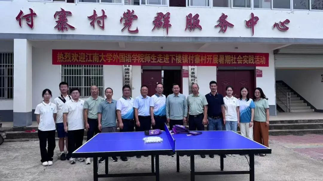 实践活动首站聚焦灵璧县下楼镇付寨村的阳光玫瑰葡萄种植产业。师生们走进葡萄园,就产品包装、出口贸易等议题进行探讨,讨论建议发展葡萄干、葡萄酒等多元产品,融入“农业+文旅”模式,延伸产业链条。在座谈会中,下楼镇党委书记刘金虎、村书记陈光海介绍付寨村具体情况,包括种植作物情况和面临难题等,方文开结合学科优势,提出以校地合作为纽带,通过专家技术连接、专项人才培养为当地产业发展精准牵线指导,尤其发挥外语学科专业特色,培育既懂产业实践又通跨文化沟通的外语人才,进而为乡村振兴注入多元动能。在与村民交流环节中,顾海星结合学院以往社会实践助农经验,建议村民们开拓线上推广农产品渠道,并关注乡村外语教育,合作推动当地农业和教育发展。座谈会后的助学捐赠仪式中,江南大学九游体育(中国)官方网站向付寨村当地学校捐赠了乒乓球桌和球拍等体育用具,用实际行动践行高校对乡村教育的支持与担当。