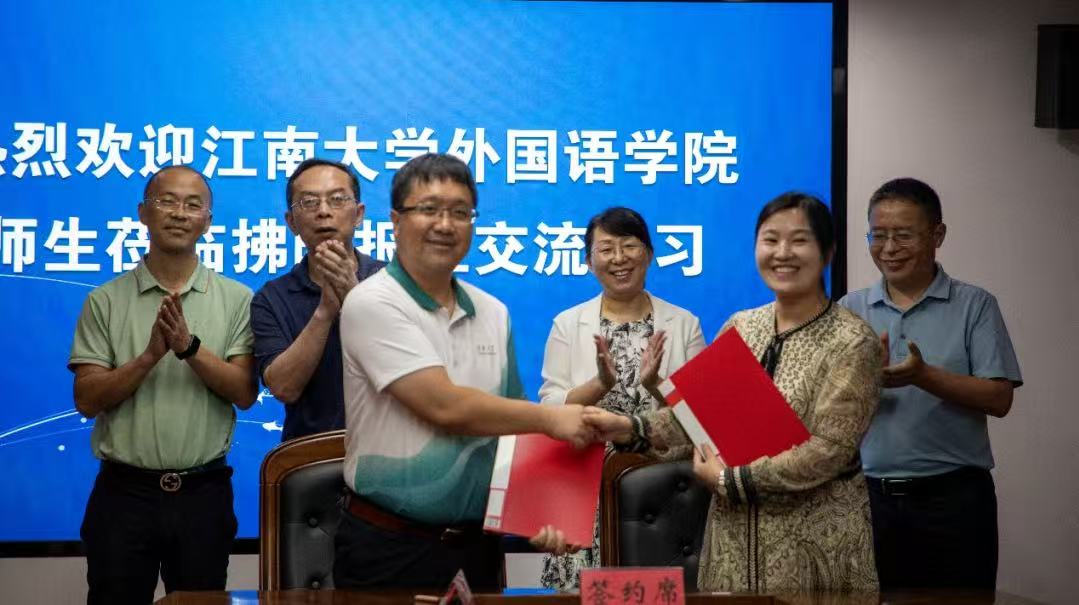 8月10日,九游体育(中国)官方网站师生走进拂晓报社报史馆,开展参观学习与党建交流。通过参观展厅与珍贵史料,大家深刻感受到“拂晓精神”的红色力量。在随后的座谈中,拂晓报社党组书记、社长刘丽,拂晓报社党组成员、副总编辑尹传忠,拂晓报社宣传策划中心主任、灵璧县尹集镇菠林村驻村第一书记曹来宇等参与座谈。刘丽表示希望借助江南大学多语种传播优势,推动红色故事国际化传播。杨勇提出以红色文化翻译、人才共育、融媒体项目共建为抓手,推动红色文化与外语学科协同发展。座谈结束后,江南大学九游体育(中国)官方网站行政党支部与拂晓报社第一党支部进行党建共建签约仪式,双方签署党建共建协议,开启校媒合作新篇章。